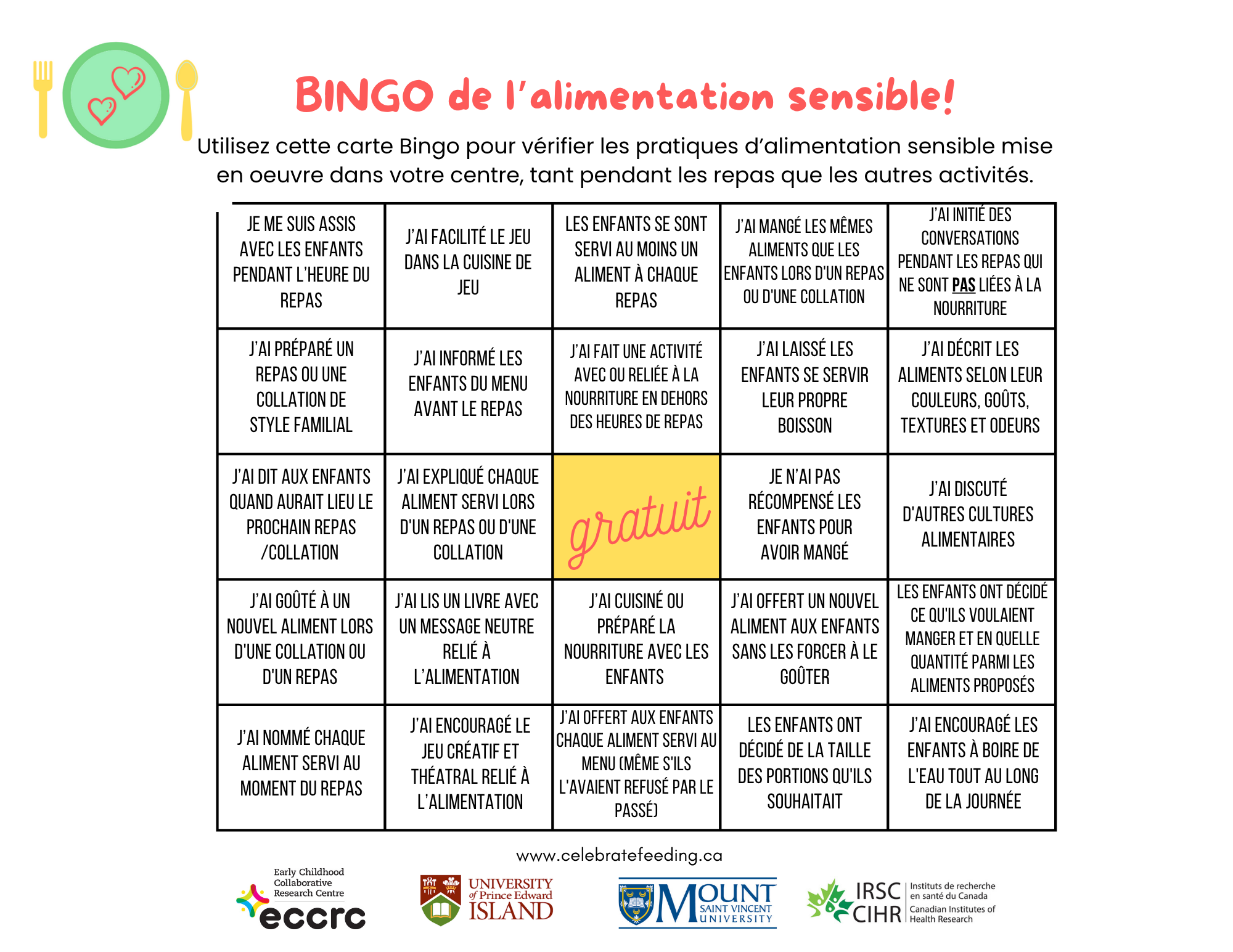 L'équipe CELEBRATE Feeding a créé diverses ressources pour aider les éducateurs à créer un environnement alimentaire plus sensible. Cliquez sur le bouton de téléchargement situé sous les images ci-dessous pour obtenir votre copie de la ressource. Si vous souhaitez télécharger une copie de toutes les ressources disponibles, veuillez sélectionner le bouton « Télécharger toutes les ressources CELEBRATE Feeding » ci-dessous